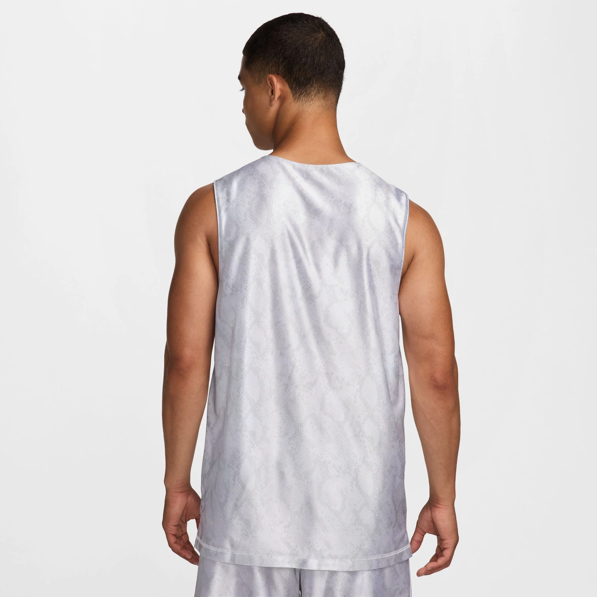 The smooth knit side features a snake skin print with the numbers 8 and 24 incorporated into the pattern. A woven tag with Kobe's sheath logo is stitched on near the hem. The mesh side is highlighted by Kobe's logo on the chest.